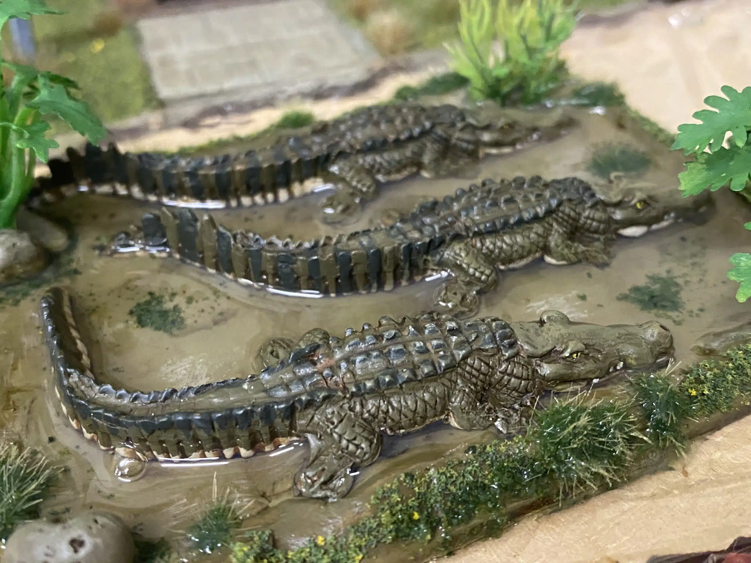 I painted the base as per my usual ‘recipe’ using the emulsion colour ‘Dehli Bazaar’, which is my favbourite mud colour, added a dark tone ink wash for some depth and then added a variety of Gamers grass tufts, scatter and some spare jungle plants from my scenery stash. Once the crocs were added back onto the base. I used Vallejo water effects to finish things off.